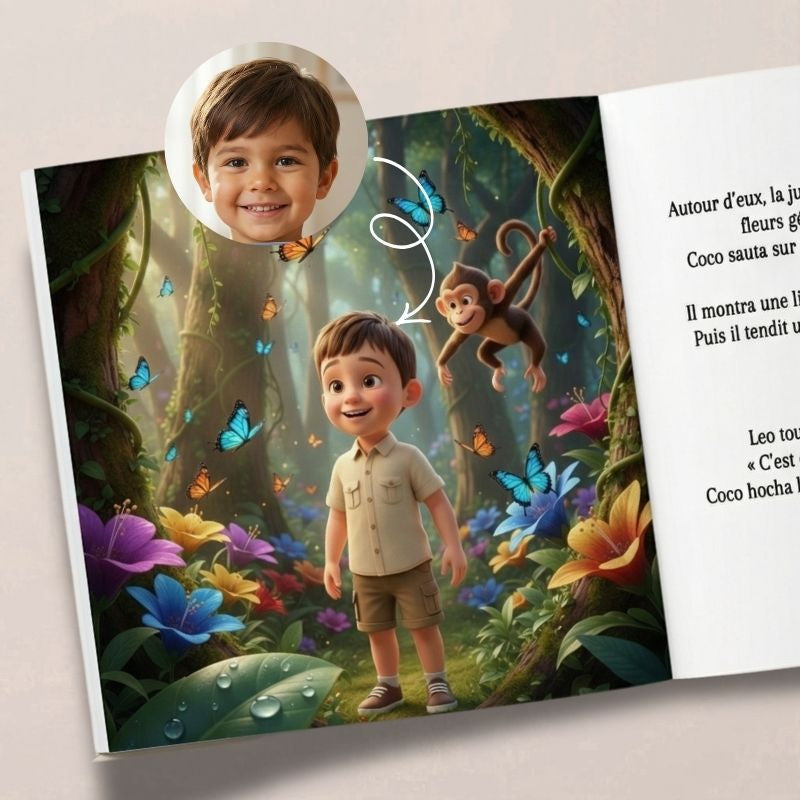 Son vrai visage intégré dans chaque illustration. Pas juste un prénom écrit — c'est lui le héros de l'histoire.