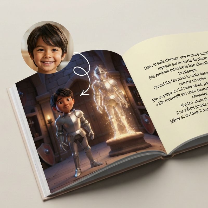 Son vrai visage intégré dans chaque illustration. Pas juste un prénom écrit — c'est lui le héros de l'histoire.
