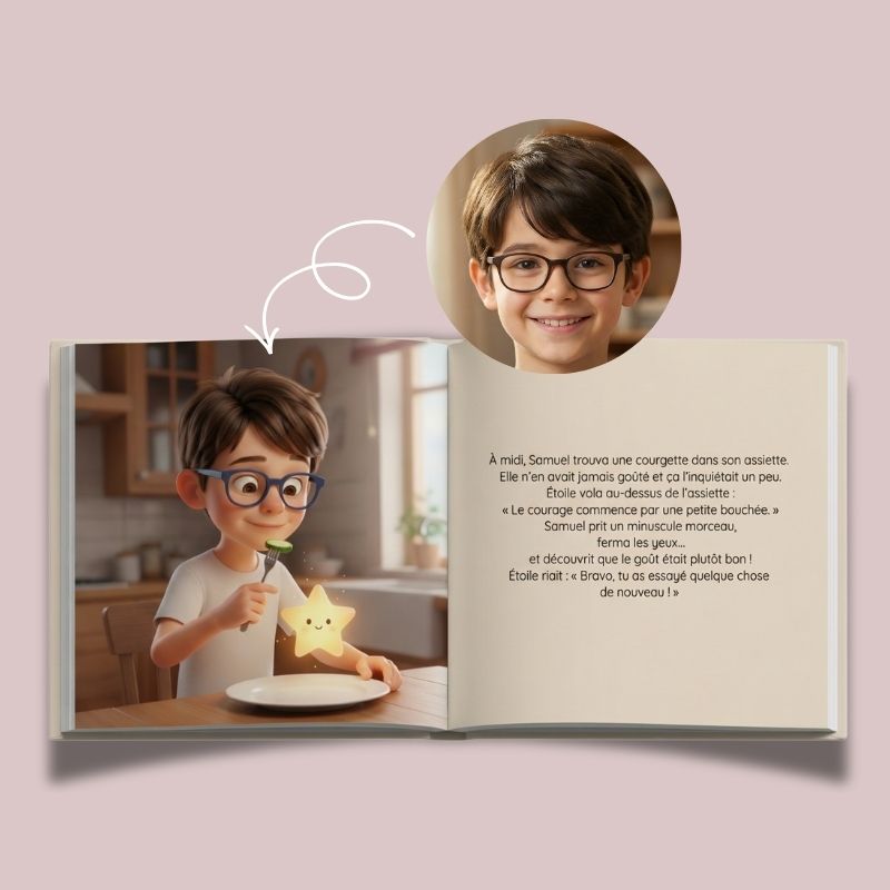 Son vrai visage intégré dans chaque illustration. Pas juste un prénom écrit — c'est lui le héros de l'histoire.