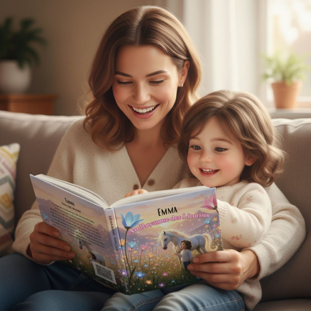 Vous personnalisez son prénom, son âge, son apparence et vous choisissez parmi 8 aventures magiques, adaptées à sa personnalité et à ses rêves ✨